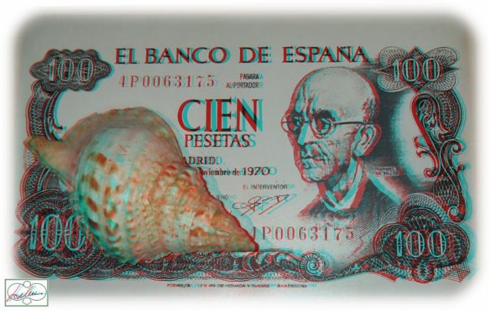 Una caracola sobre una ampliación de un billete de cien pesetas. Símbolo de Fortuna. Es una foto sencilla estéreo que pertenece a un efecto de contraste de planos.