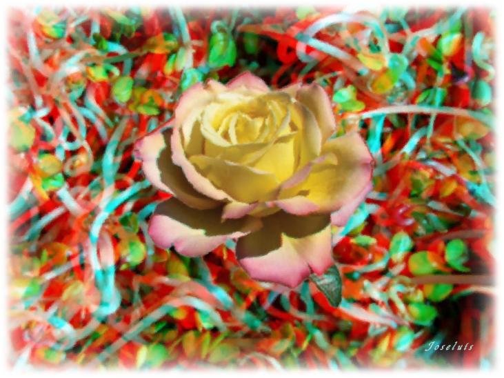Dos Anaglifos superpuestos, rosa y semillas de fondo.